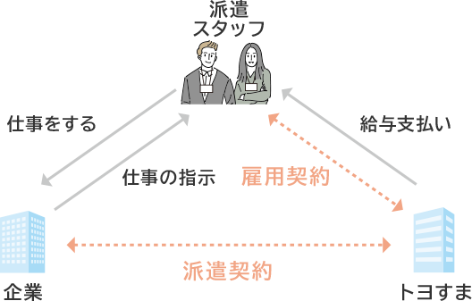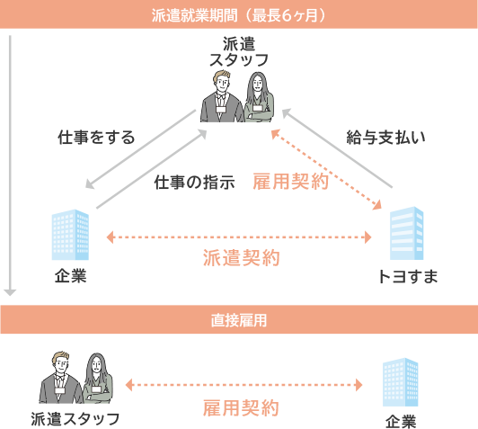 派遣スタッフの直接雇⽤を前提として⼀定期間(最⻑6ヶ⽉間)派遣スタッフを受⼊れ、貴社と派遣スタッフ双⽅の要望が⼀致すれば直接雇⽤に切り替える派遣システムです。