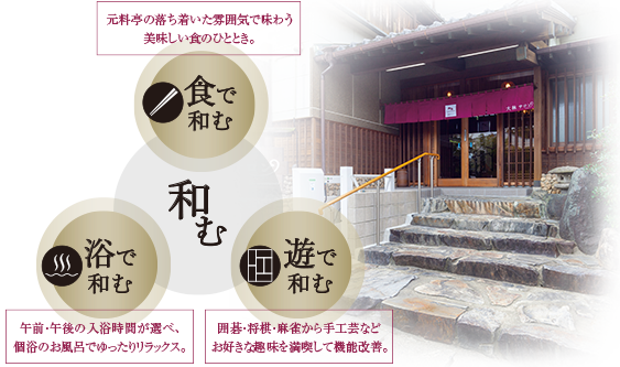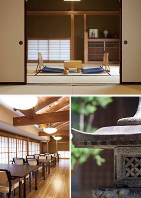 開放感に満ちあふれた空間、懐かしい畳の薫り、たおやかな陽射し目映い庭園。まるで、昭和の良き時代が甦るような雰囲気の中、昔を思い出すことで心が自然に癒されます。