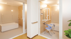 玄関前の段差解消リフトやスロープ、車椅子でも安全なリフト入浴や多機能トイレなど、和の趣はそのままで安全設備を徹底。また、スタッフの細かい気配りも大きな安心です。